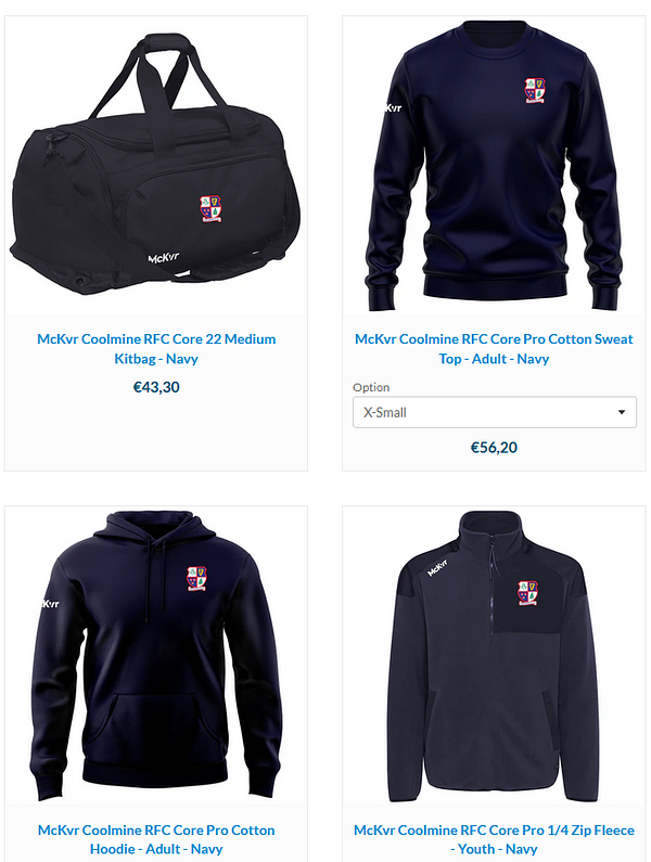 To view the full catalogue, or order some club gear please visit https://www.mckeeversports.ie/collections/coolmine-rfc