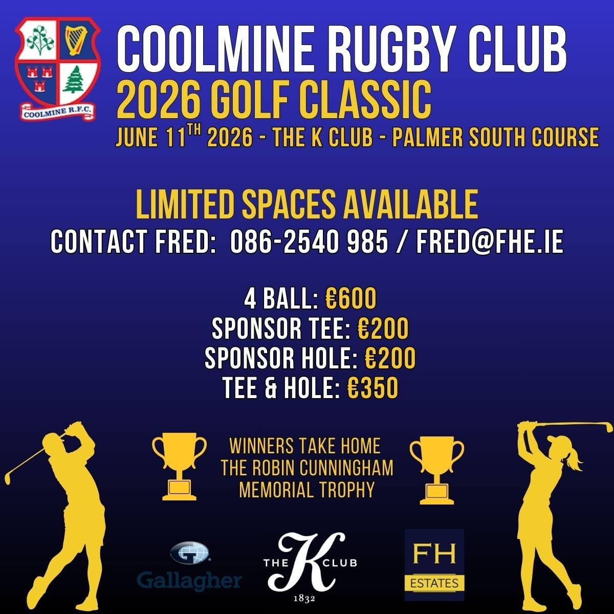 SelectPay the entry fee for a four-ball to play in the annual Coolmine RFC Golf Classic. We return to the K Club (Palmer South Course) on Thursday 11 June.
