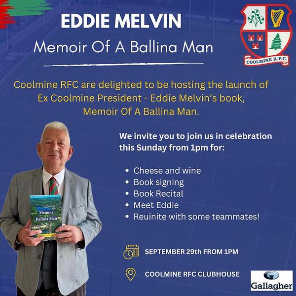 Coolmine RFC is delighted to host the launch of former Coolmine President Eddie Melvin’s book - Memoir Of A Ballina Man.