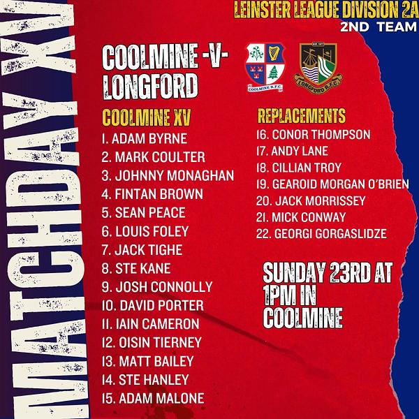 Here is the teamsheet for our 2nd XV in their Leinster Seconds League Div 2A game against Longford.