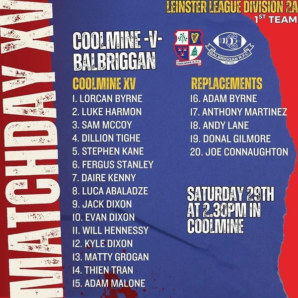 Here is the teamsheet for our 1st XV, who take on Balbriggan in Ashbrook tomorrow, with a 14:30 ko.